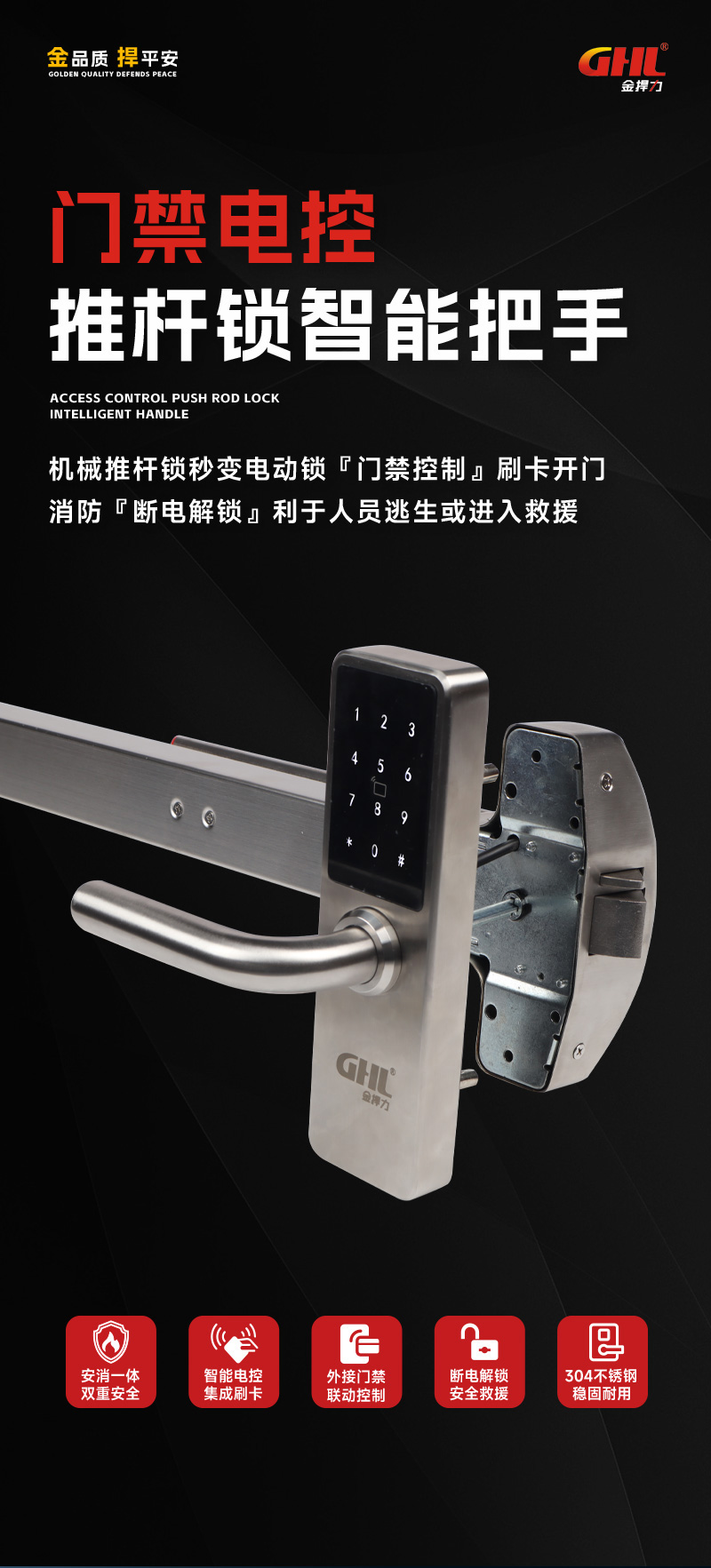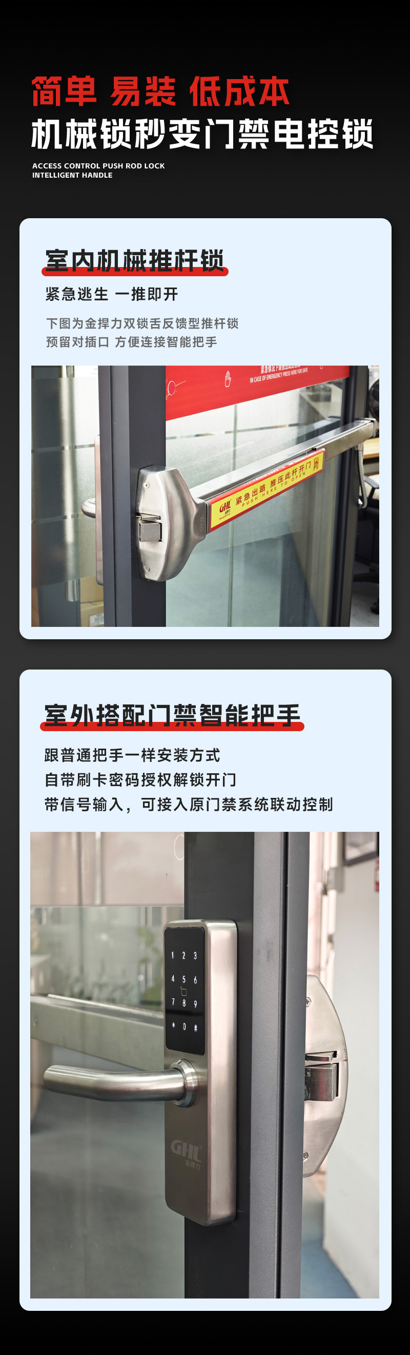 • 内部搭配机械逃生门锁,紧急情况下一推即开,无需任何操作知识