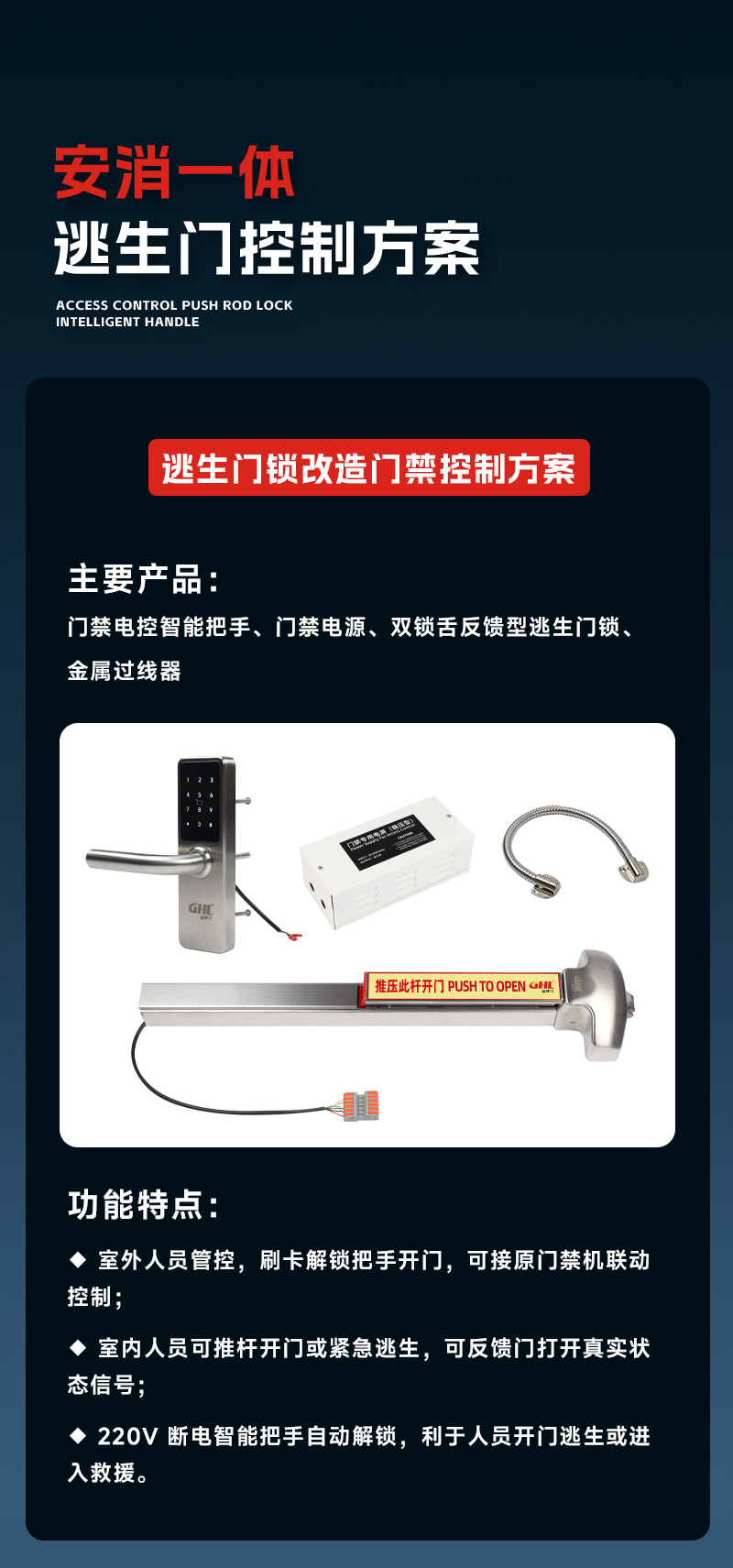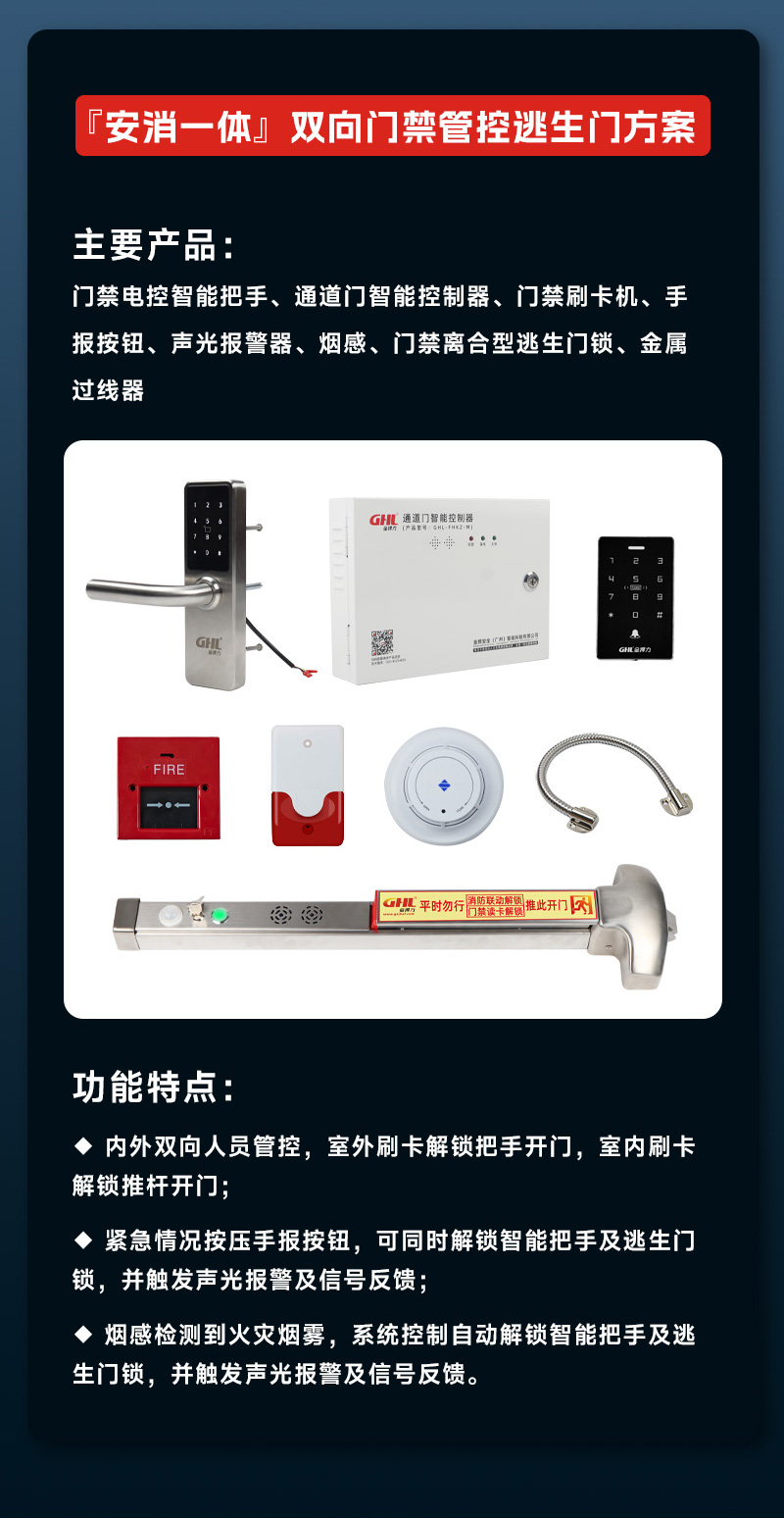 • 内部搭配门禁离合型逃生门锁,实现人员管控,刷卡授权或消防联动解锁才能推杆开门